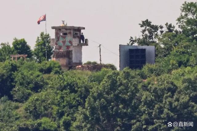 临近韩国京畿道坡州朝韩非军事区附近,朝鲜士兵站在一座瞭望塔内守望。