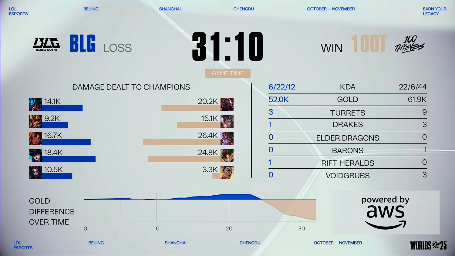 结果这一局比赛,双方各打了半场好局,下半场BLG发挥失利,100T笑到了最后。7分钟左右,河道爆发团战,对方打出一换二,同时BLG上单在上路被击杀;11分钟左右,BLG在中路击杀对方辅助后拿下第一条小龙;15分钟左右,BLG拿下峡谷先锋,随后100T抓单击杀BLG辅助,同时BLG推掉上路一塔拿下一血塔,对方拿下小龙;23分钟左右,100T拿下小龙后打出二换五,顺势拿下荆棘厄塔汗,BLG复活后对方又打出零换二;25分钟左右,100T打出零换三,并推掉BLG中一塔,顺势拿下大龙;27分钟,100T击杀BLG打野,随后推掉BLG两座二塔;最终31分10秒,100T打出一换五,一波推掉BLG基地,本局比赛失利。
